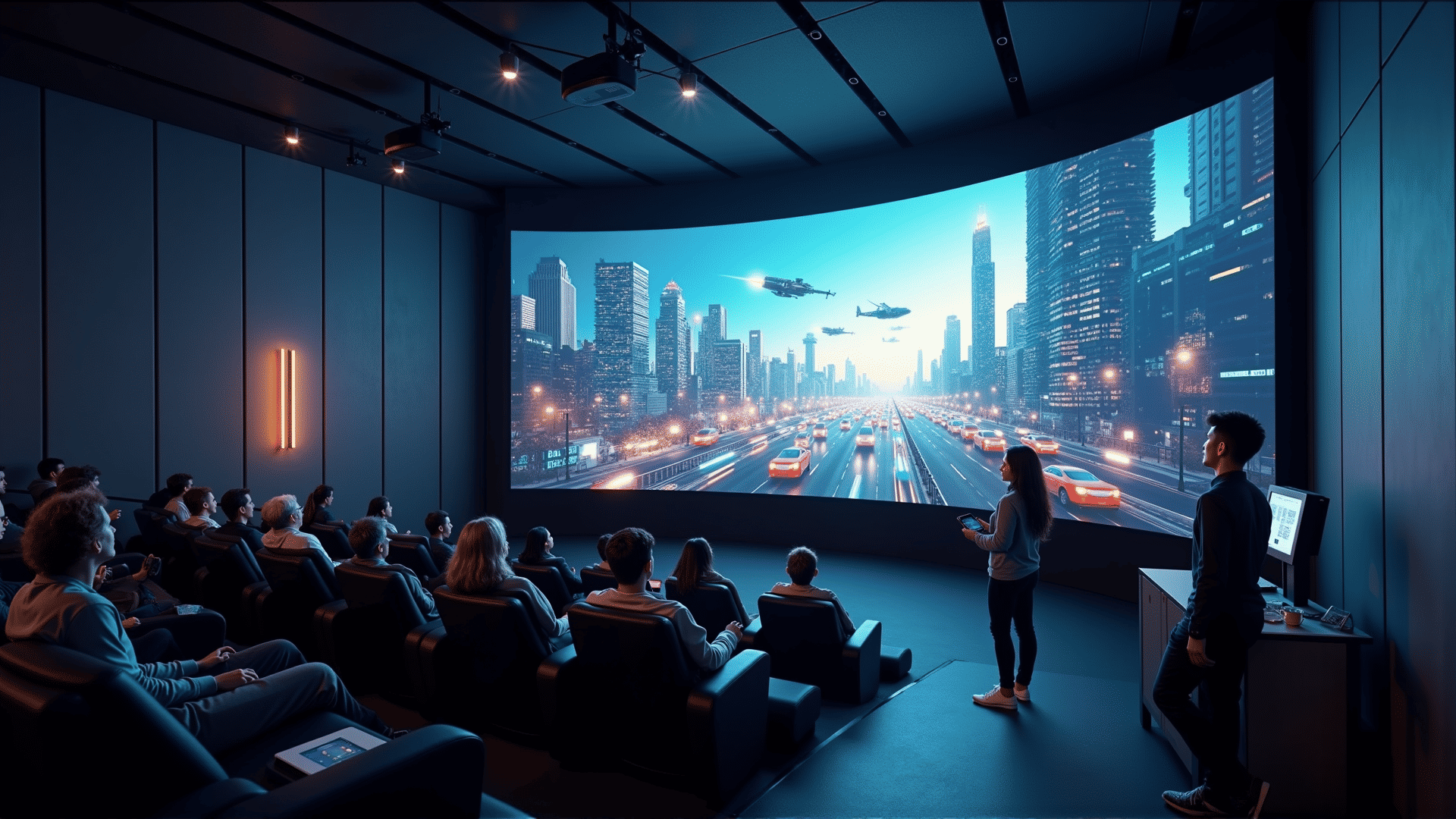 У сучасних кінотеатрах застосовуються такі технології, як 4K-проекція, Dolby Atmos звук та HDR ефекти.